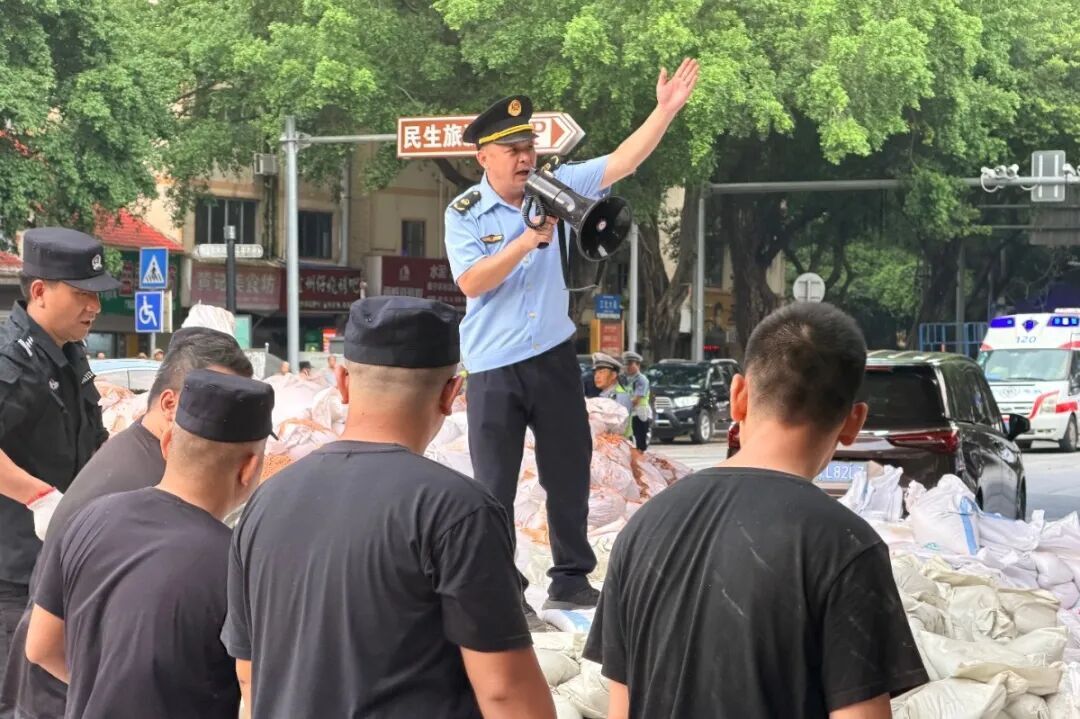 在砂石装运点,南宁市应急管理综合行政执法支队支队长梁朝正有条不紊地指挥救援队伍搬运沙包,“请大家注意,我们采取各方支援队伍轮番搬运的方式,每次搬运150—200个沙包,再轮换休整!”在他的带动下,各支队伍紧张有序,用身体筑成通道传递沙包,筑牢防汛的“铜墙铁壁” 。