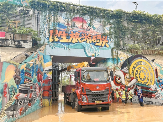 11时许,随着现场开闸指令,搬沙袋、清淤泥、排积水,各项工作有条不紊开展;两辆重载30吨的卡车缓缓驶出闸门,开闸队伍分工合作,密切配合。经过各部门一个多小时的共同努力,12时,民生广场旅游码头交通闸门口的沙袋全部搬离,闸门重新恢复开启状态。