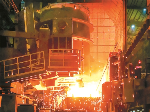 桂林平钢钢铁有限公司工作人员在操作炼钢电弧炉。苏 桂/摄