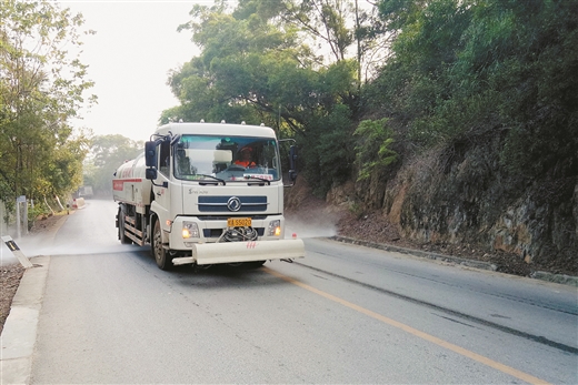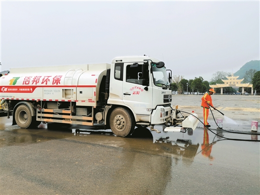 专业清洁工在田阳县百育镇敢壮山景区清洗道路。