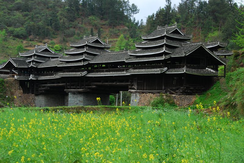桥长50米,宽4.5米,水面到桥顶高12米,二台一墩三亭。桥面分人行和畜行道,畜行道悬于桥侧,与现代双层立交桥有异曲同工之妙。是古今中外建桥史上绝无仅有的木建筑立交桥。2001年6月25日国务院公布为全国重点文物保护单位。