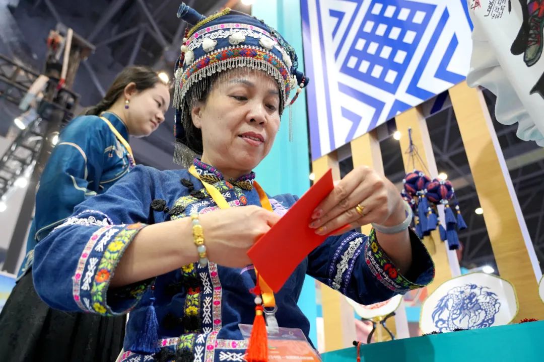 2023年10月13日至15日,罗城组织参加2023中国—东盟博览会旅游展,仫佬族剪纸技艺非物质文化遗产传承人罗华清在剪纸。
