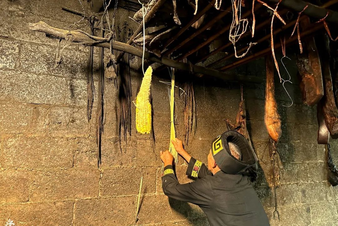 郭卜龙将新采的稻谷悬挂于灶台之上。甘艳霞 摄