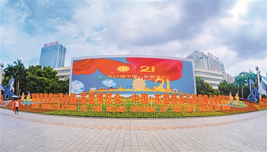 9月18日,随着第21届中国—东盟博览会、中国—东盟商务与投资峰会日益临近,在南宁市民族大道沿线,多个主题花坛已经布置完成,盛装迎接盛会到来。周军 摄