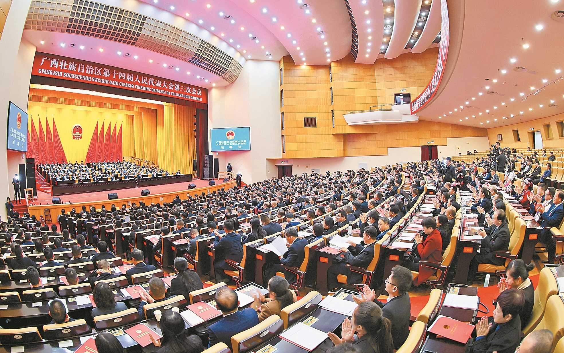 1月17日上午,广西壮族自治区第十四届人民代表大会第三次会议圆满完成各项议程,在广西人民会堂胜利闭幕。