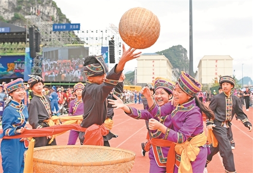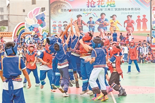 ②4月16日,百色市田阳区第五小学举行抢花炮等“三月三”民族特色体育活动,同学们在体育竞技中感受传统文化的独特魅力。周加孔 摄