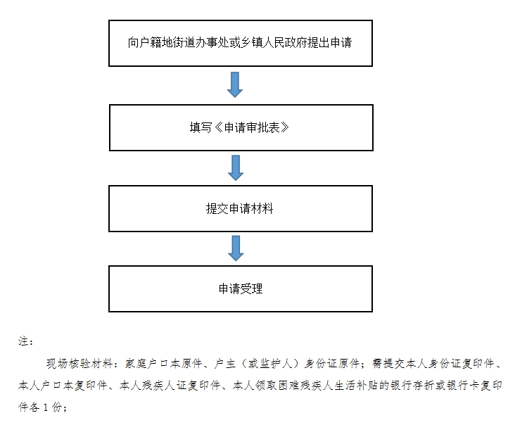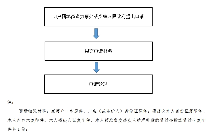 ♥温馨提示:困难残疾人生活补贴和重度残疾人护理补贴,由残疾人向户籍所在地街道办事处或乡镇人民政府提出申请。残疾人的法定监护人,法定赡养、抚养、扶养义务人,所在村民(居民)委员会或其他受托人可以代为办理申请事宜。