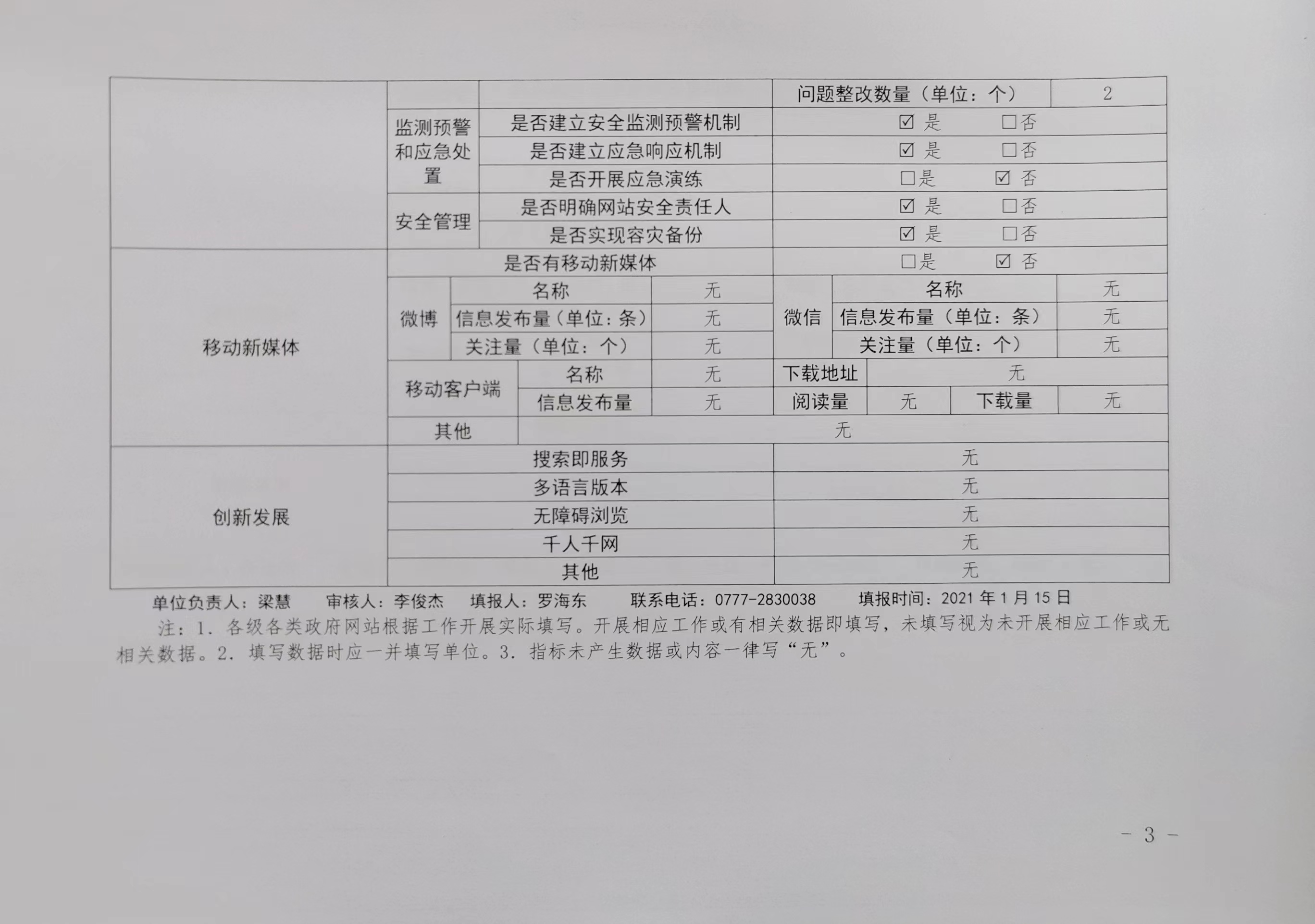 单位负责人:梁慧 审核人:李俊杰 填报人:罗海东 联系电话:0777-2830038 填报时间:2021年1月15日