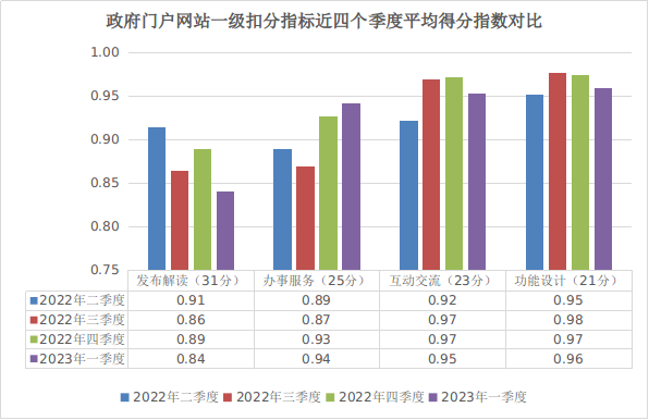 第一季度,政府门户网站共计126家,检查合格率为88.1%,较2022年第四季度的合格率89.7%下降1.6%。其中,市级政府门户网站合格率为92.9%,与2022年第四季度持平;县级政府门户网站合格率为87.4%,较2022年第四季度的合格率89.2%下降1.8%。本次检查,政府门户网站总分平均分为97.16分,较2022年第四季度100.88分降低3.72分;得分高于100分的政府门户网站有101家,占比80.2%,较2022年第四季度的88.9%下降8.7%。从一级扣分指标考评情况看,办事服务得分指数有所提高,为0.94,是近一年来最高得分值;功能设计得分指数(0.96)、互动交流得分指数(0.95)、发布解读得分指数(0.84)较上一季度均有所下降。