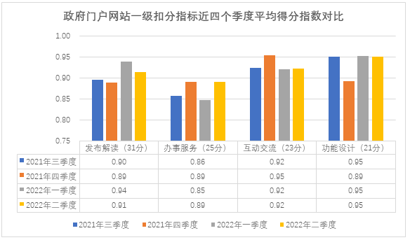 从一级扣分指标表现情况看,功能设计得分指数最高,为0.95,与上一季度持平;办事服务得分指数有所回升,与得分较高的2021年第四季度持平,在第一季度检查出较多问题后,多数网站针对办事服务进行了较为认真的排查整改;发布解读较上一季度有所下降,主要表现在概况信息更新不及时,少数门户网站中人口、经济等概况信息未更新至2021年度。