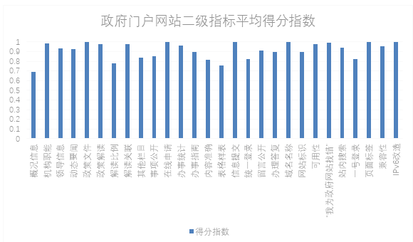 从二级扣分指标表现情况看,政府门户网站在机构职能、领导信息、动态要闻、政策文件、政策解读、解读关联、在线申请、办事统计、办事指南、信息提交、留言公开、办理答复、域名名称、网站标识、可用性、“我为政府网站找错”、站内搜索、页面标签、兼容性、IPv6改造等方面表现较好,指标得分指数均超过0.9,但在概况信息、解读比例、其他栏目、事项公开、内容准确、表格样表、统一登录、一号登录等指标上仍有一定提升空间,其中概况信息、解读比例、表格样表得分不够理想,平均得分指数不足0.8。