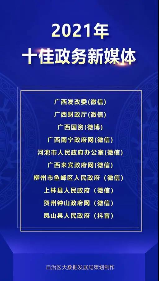 为进一步提升广西政务新媒体传播力、引导力、影响力、公信力,构建政务新媒体规范、创新、融合发展新格局,今年以来,自治区大数据发展局委托第三方机构并组建专家评审团,围绕渠道建设、发布信息、互动交流、融合创新等情况,选出2021年广西“十佳政务新媒体”,现将结果公布如下: