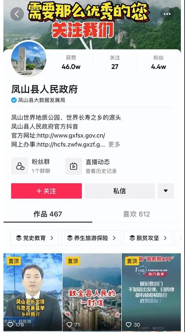 入选理由:包括了党史教育、养生旅游探险、脱贫攻坚、平安凤山、疫情防控等五大类内容,借助抖音平台开通的粉丝群更加畅通了互动渠道。