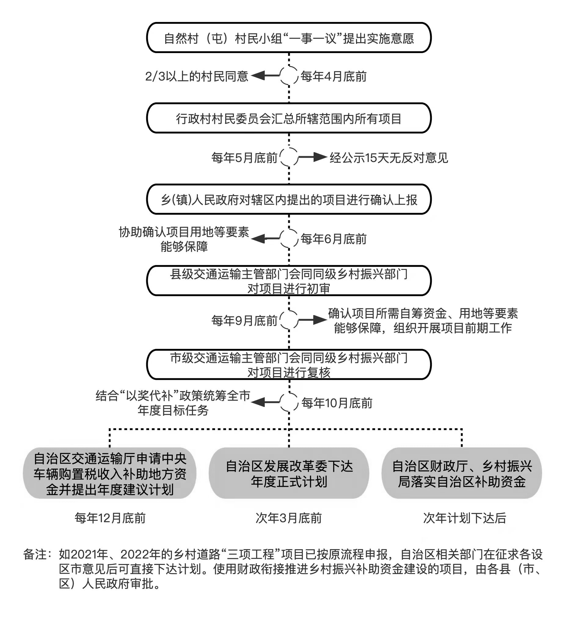 (二)规范项目管理。实施乡村道路“三项工程”项目,要按照“自治区统筹、市县组织、乡村上报”的程序,由自然村(屯)村民小组按“一事一议”的方式提出申请,行政村村民委员会汇总,乡(镇)人民政府确认,县级交通运输主管部门会同同级乡村振兴部门初审,市级交通运输主管部门会同同级乡村振兴部门复核上报,自治区纳入年度计划。各设区市、县(市、区)人民政府要加强对国家和自治区补助资金使用的管理,杜绝挤占、挪用和截留现象;对擅自改变补助资金用途的,要依法依规严肃处理,切实保障补助资金专款专用。