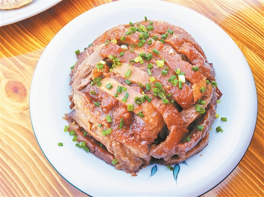 “这道菜传承了中原南迁的梅干菜焖肉技法,要经过煮、炸、腌、蒸四道工序。”朱勇边说边将肥瘦相间的五花肉焯水,接着用针尖在温热的肉皮上均匀刺孔,随后下油锅。“滋滋滋”,油面瞬间沸腾,气泡从肉皮细孔涌出,在琥珀色油浪中欢腾。渐渐地,肉皮染上金棕色,虎皮纹如漓江石上镌刻千年的水波纹般灿烂绽开。