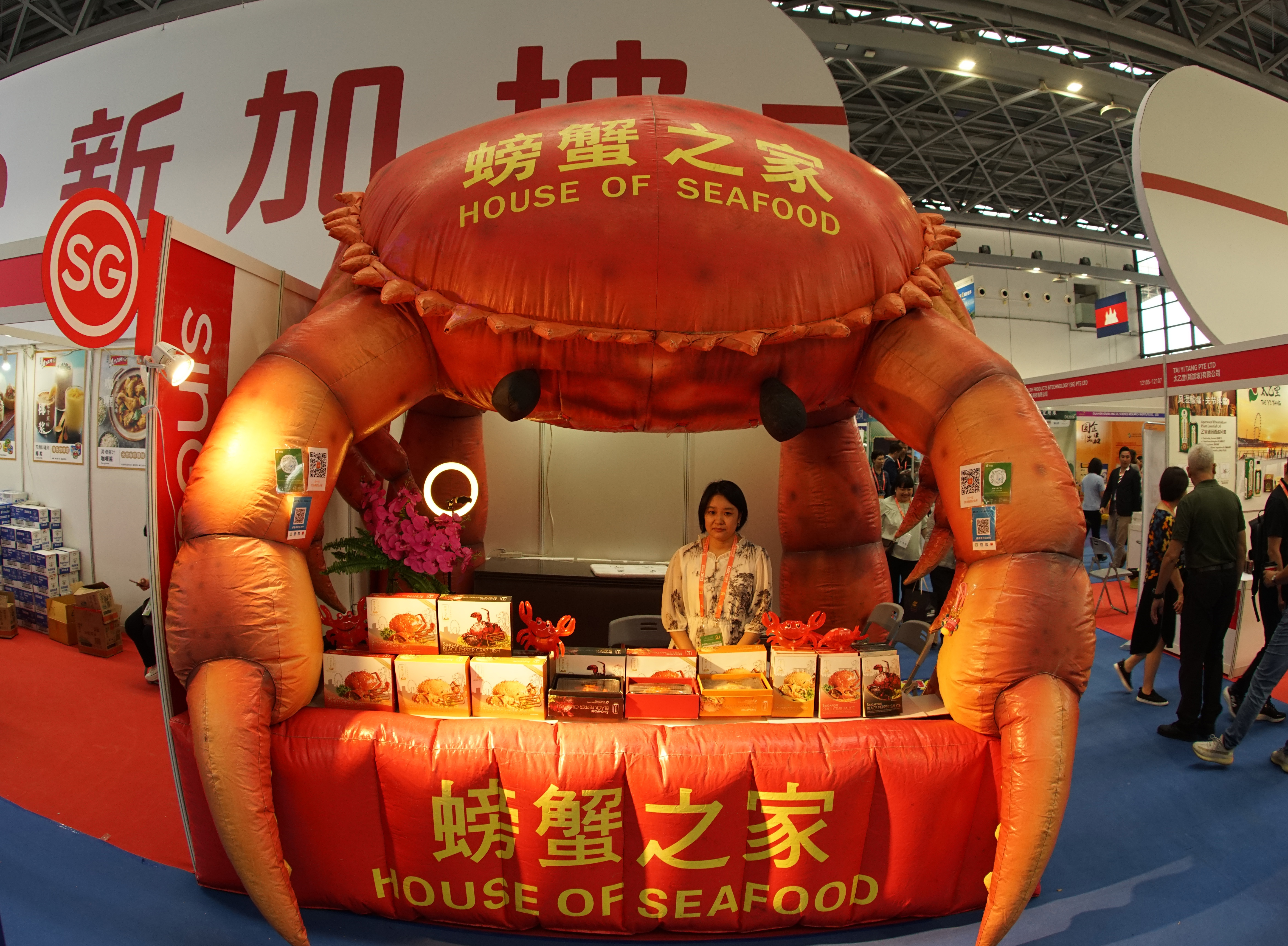 在新加坡商品馆,一位参展商将展位外观设计成螃蟹的造型。梁凯昌 摄