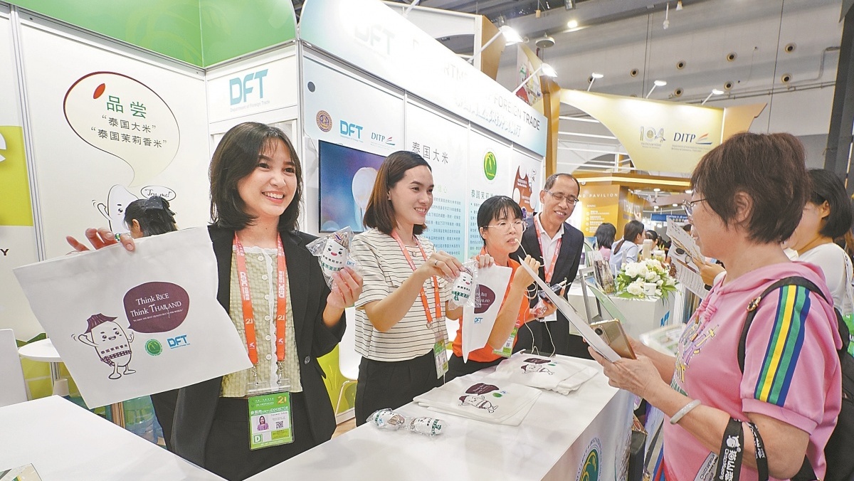 9月27日,在东博会泰国馆,参展商通过有奖问答的形式向观众推介泰国香米。周军 摄