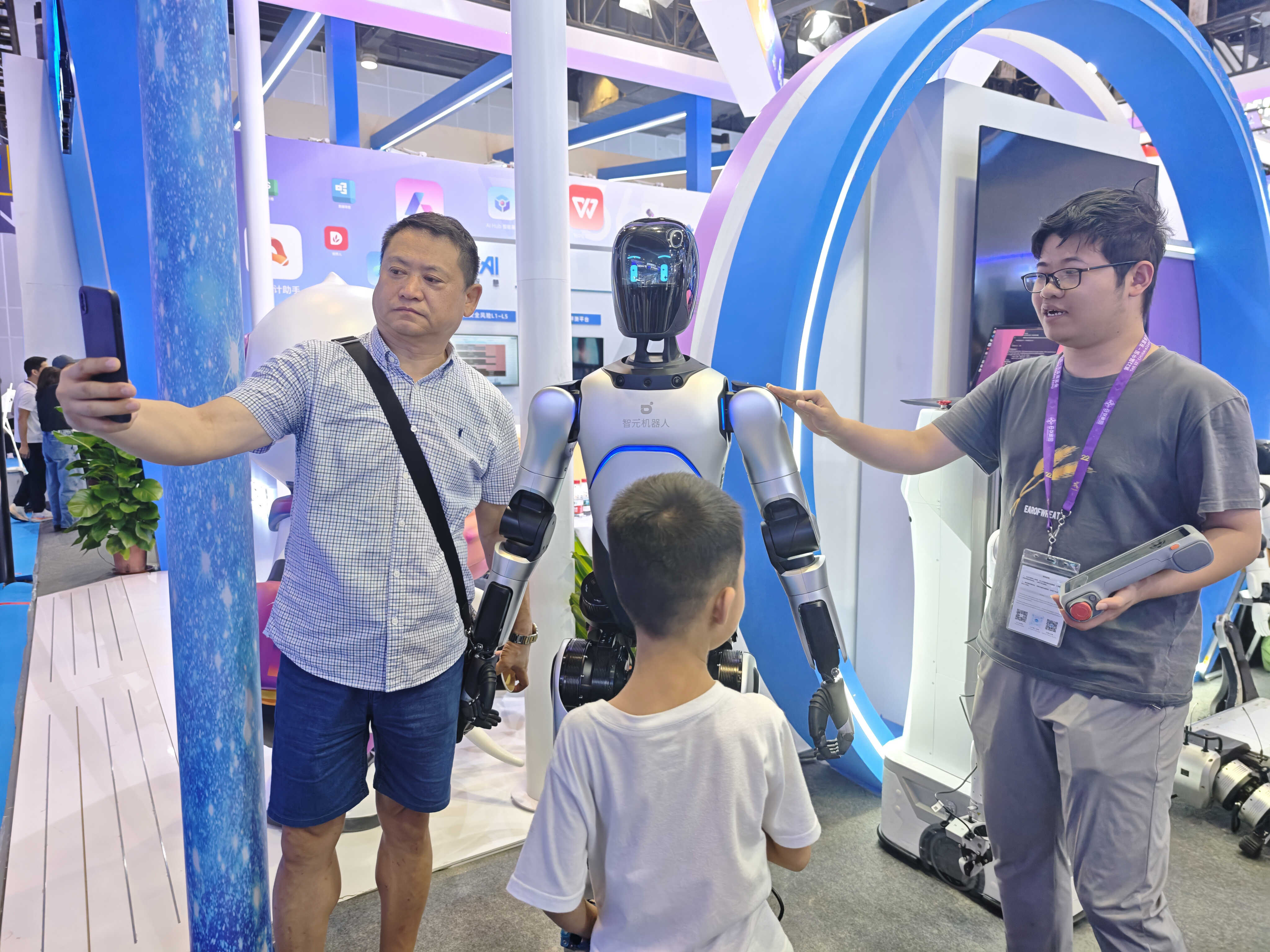 观众争相与担任本届东博会司仪的上海智元“远征A2”机器人合影。郭燕群 摄