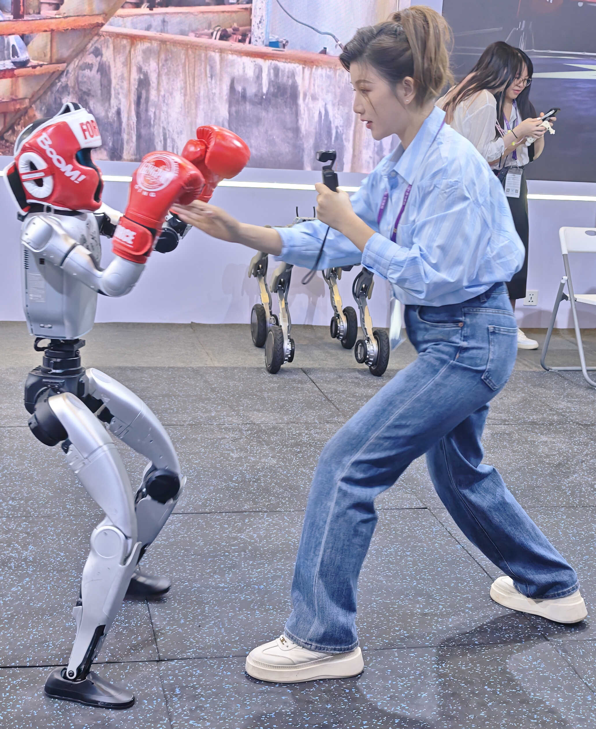 观众与宇树机器人进行比试。 郭燕群 摄