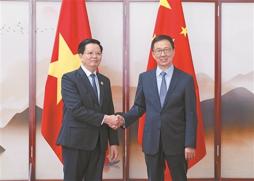 会见梅文政时,韩正表示,中越两党两国高层保持频密交往,就推进全面战略合作达成重要共识,为新形势下中越命运共同体建设指明方向。今年是两国建交75周年暨“人文交流年”。中方愿同越方一道,以两党两国领导人战略共识为指引,赓续传统友谊,深化互利合作,加快构建具有战略意义的中越命运共同体,为各自社会主义现代化建设注入强劲动力。