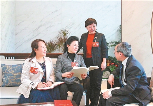 3月3日,住桂全国政协委员梁满红、杨英、韦震玲、戴红兵(从左至右)在驻地交流参会心得,完善提案。潘柯君 摄