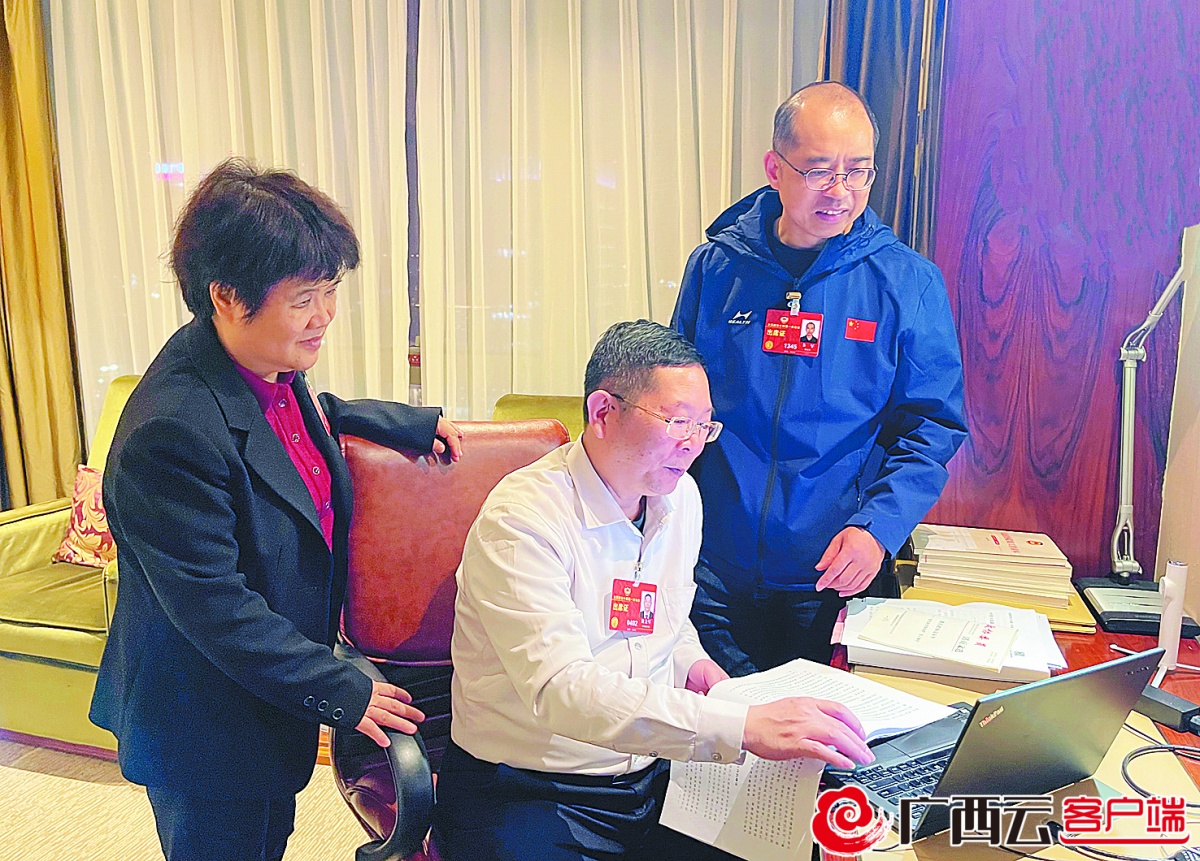 3月3日,住桂全国政协委员杜丽群、欧余军、韦军(从左至右)在驻地讨论交流,对提案进行修改完善。张树新 摄
