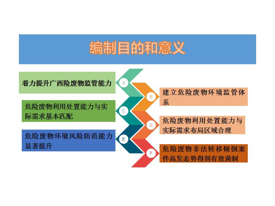 着力提升广西险废物监管能力、利用处置能力和环境风险防范能力建设,主要是建立健全“源头严防、过程严管、后果严惩”的危险废物环境监管体系;危险废物利用处置能力与实际需求基本匹配、布局区域合理;危险废物环境风险防范能力显著提升,危险废物非法转移倾倒案件高发态势得到有效遏制,切实维护生态环境安全和人民群众身体健康。