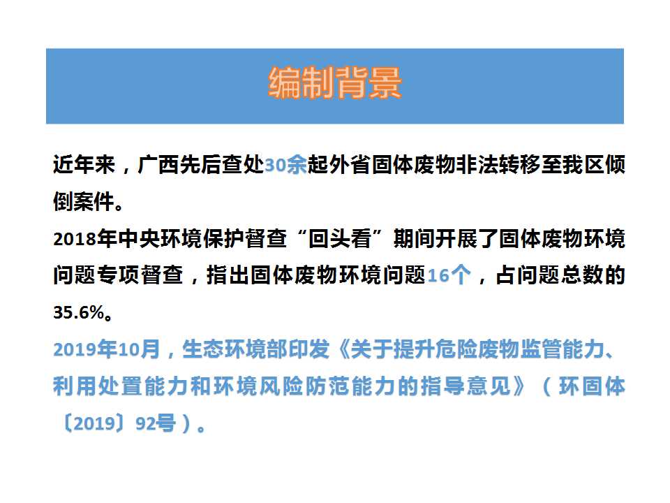 近年来,广西先后查处30余起外省固体废物非法转移至我区倾倒案件,2018年中央环境保护督查“回头看”期间开展了固体废物环境问题专项督查,指出固体废物环境问题16个,占问题总数的35.6%。固体废物环境问题已成为我区的重点生态环境问题。2019年10月,生态环境部印发《关于提升危险废物监管能力、利用处置能力和环境风险防范能力的指导意见》(环固体〔2019〕92号),为落实好文件精神,结合广西危险废物管理工作现状和需求,制定《工作措施》。