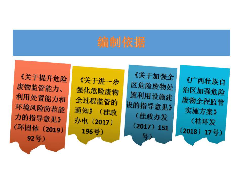 生态环境部《关于提升危险废物监管能力、利用处置能力和环境风险防范能力的指导意见》(环固体〔2019〕92号),自治区人民政府办公厅《关于进一步强化危险废物全过程监管的通知》(桂政办电〔2017〕196号)、《关于加强全区危险废物处置利用设施建设的指导意见》(桂政办发(2017)151号),《广西壮族自治区加强危险废物全程监管实施方案》(桂环发〔2018〕17号)等文件。