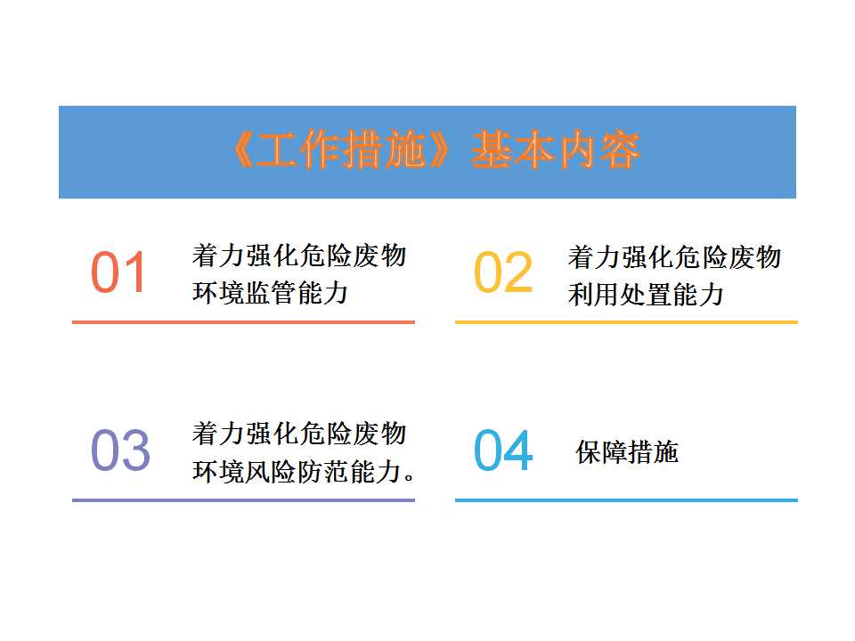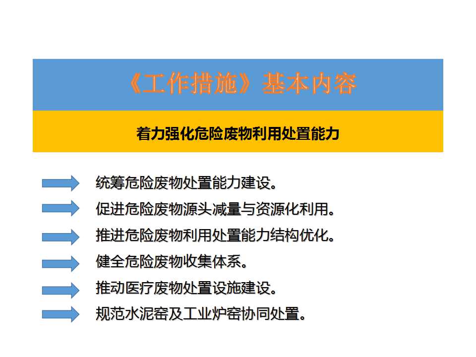 包括:统筹危险废物处置能力建设、促进危险废物源头减量与资源化利用、推进危险废物利用处置能力结构优化、健全危险废物收集体系、健全危险废物收集体系、规范水泥窑及工业炉窑协同处置等方面内容。