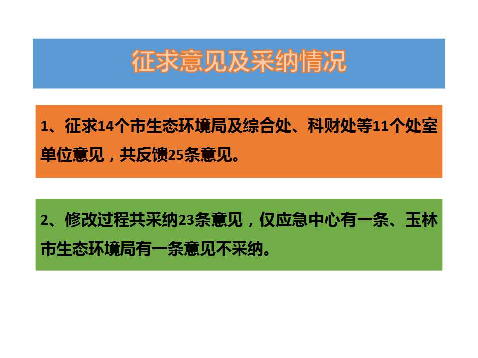 《工作措施》征求14个市生态环境局及综合处、科财处等11个处室单位意见,共反馈25条意见。意见反馈及采纳情况见下表。修改过程共采纳23条意见,仅应急中心有一条、玉林市生态环境局有一条意见不采纳。