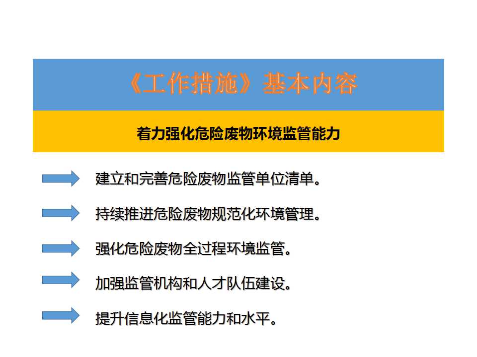 包括:建立和完善危险废物监管单位清单、持续推进危险废物规范化环境管理、强化危险废物全过程环境监管、加强监管机构和人才队伍建设、提升信息化监管能力和水平等方面内容。