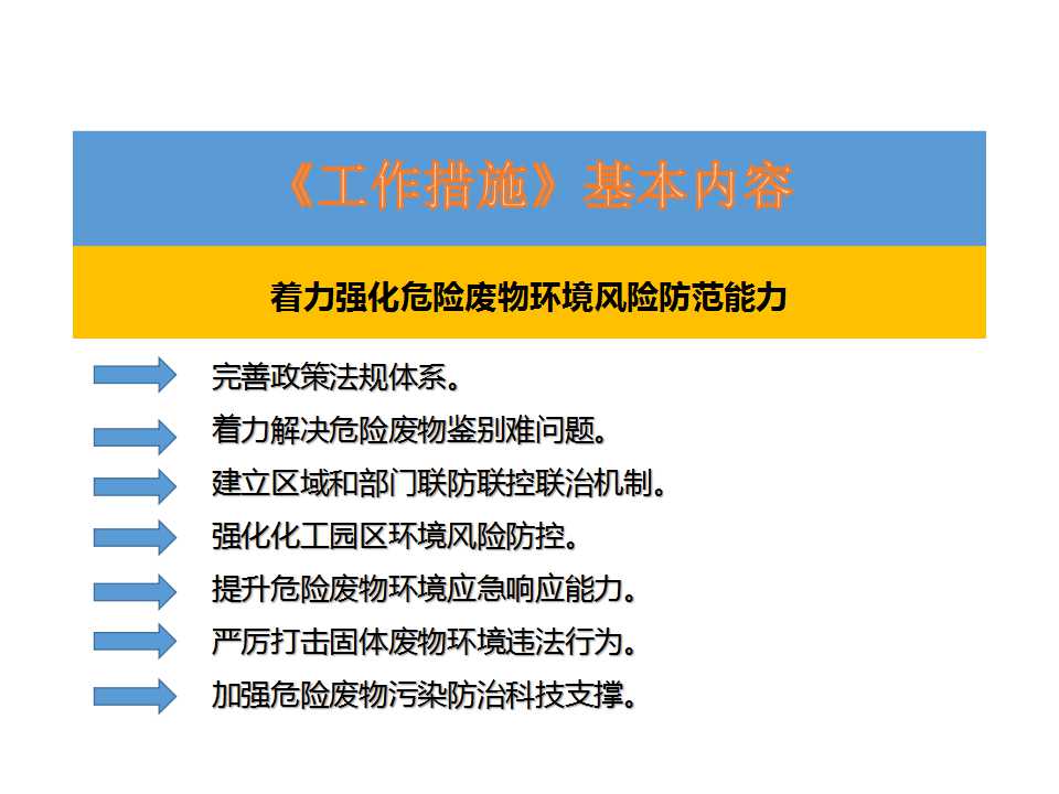 包括:完善政策法规体系、着力解决危险废物鉴别难问题、建立区域和部门联防联控联治机制、强化化工园区环境风险防控、提升危险废物环境应急响应能力、严厉打击固体废物环境违法行为、加强危险废物污染防治科技支撑等方面内容。