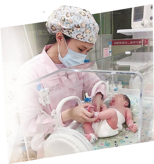 护士给暖箱内新生儿进行抚触治疗。