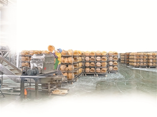 在广西来冰食品有限责任公司,工人将圆饼状结晶冰糖移至专用推车,送往后续的筛分或干燥流程。规模化的作业场景,体现着来宾糖业正走向高端化。