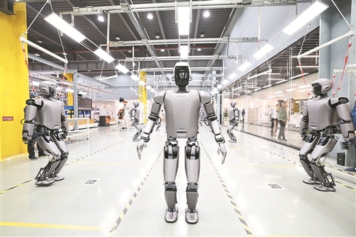 7月21日,柳州优必选智能科技有限公司生产车间内,成品工业人形机器人正在做程序调试。邓华 摄
