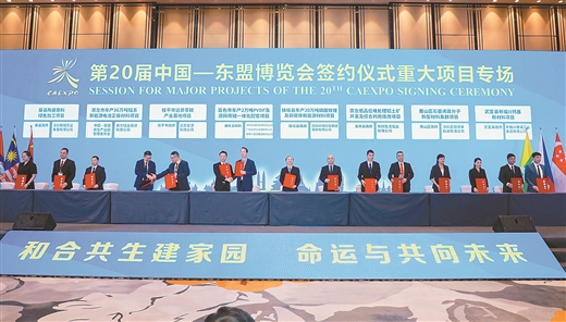 9月17日,第20届中国—东盟博览会签约仪式在南宁举行,共筛选组织现场集中签约项目184个,其中投资合作项目170个、国际贸易和“走出去”国外投资项目14个。记者从签约仪式上获悉,今年东博会与峰会期间,主办方共组织签订投资合作项目470个,总投资额4873亿元,其中制造业投资占比超过65%,活动场次、项目数量、投资总额和制造业投资占比均创历届新高。