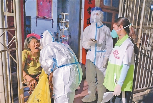 北海市多措并举确保核酸检测应检尽检,不漏一户,不落一人。图为医护人员在海城区中街公园路社区上门给行动不便的老人做核酸检测。陈继谋 摄