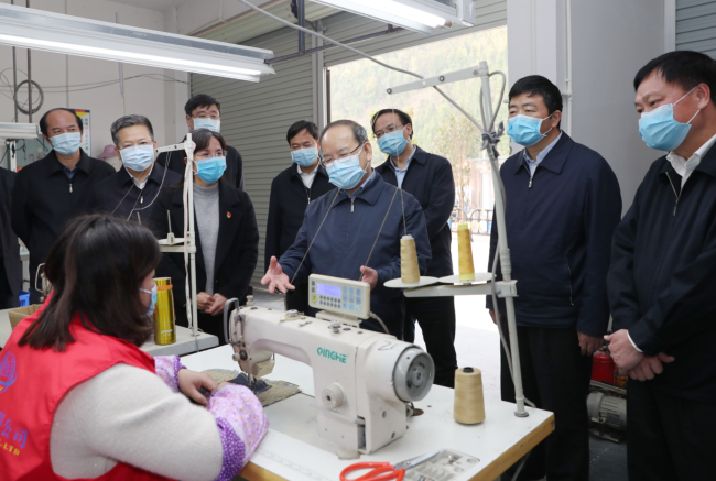 2月24日至25日,自治区党委书记、自治区人大常委会主任鹿心社深入百色市那坡县和靖西市调研。这是在那坡县华伟服装公司扶贫车间,鹿心社针对扶贫车间运营遇到的问题,强调要引导农民工特别是熟练技工到扶贫车间就地就业,实现农民增收和支持本地企业发展互促互进。黄克 摄