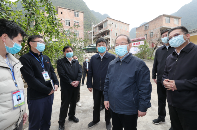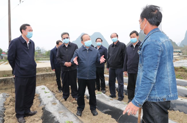 中央统筹推进新冠肺炎疫情防控和经济社会发展工作部署会议结束后,自治区党委、政府立即召开会议对全区学习贯彻落实习近平总书记重要讲话精神作出部署。2月24日至25日,自治区党委书记、自治区人大常委会主任鹿心社深入百色市那坡县和靖西市调研,强调要深入贯彻落实习近平总书记重要讲话精神,按照自治区的部署安排,坚定信心决心,坚持问题导向,精准务实施策,着力补短板强弱项,科学统筹推进疫情防控和脱贫攻坚各项工作,努力将疫情对脱贫攻坚影响降到最低,坚决打赢脱贫攻坚这场硬仗,确保与全国同步全面建成小康社会。