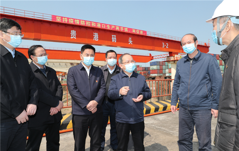 2月18日,自治区党委书记、自治区新冠肺炎疫情防控工作领导小组组长鹿心社深入贵港市,调研指导新冠肺炎疫情防控和经济社会发展工作。这是在北部湾港贵港集装箱码头,鹿心社详细了解港口复产情况和疫情防控工作。黄 克/摄
