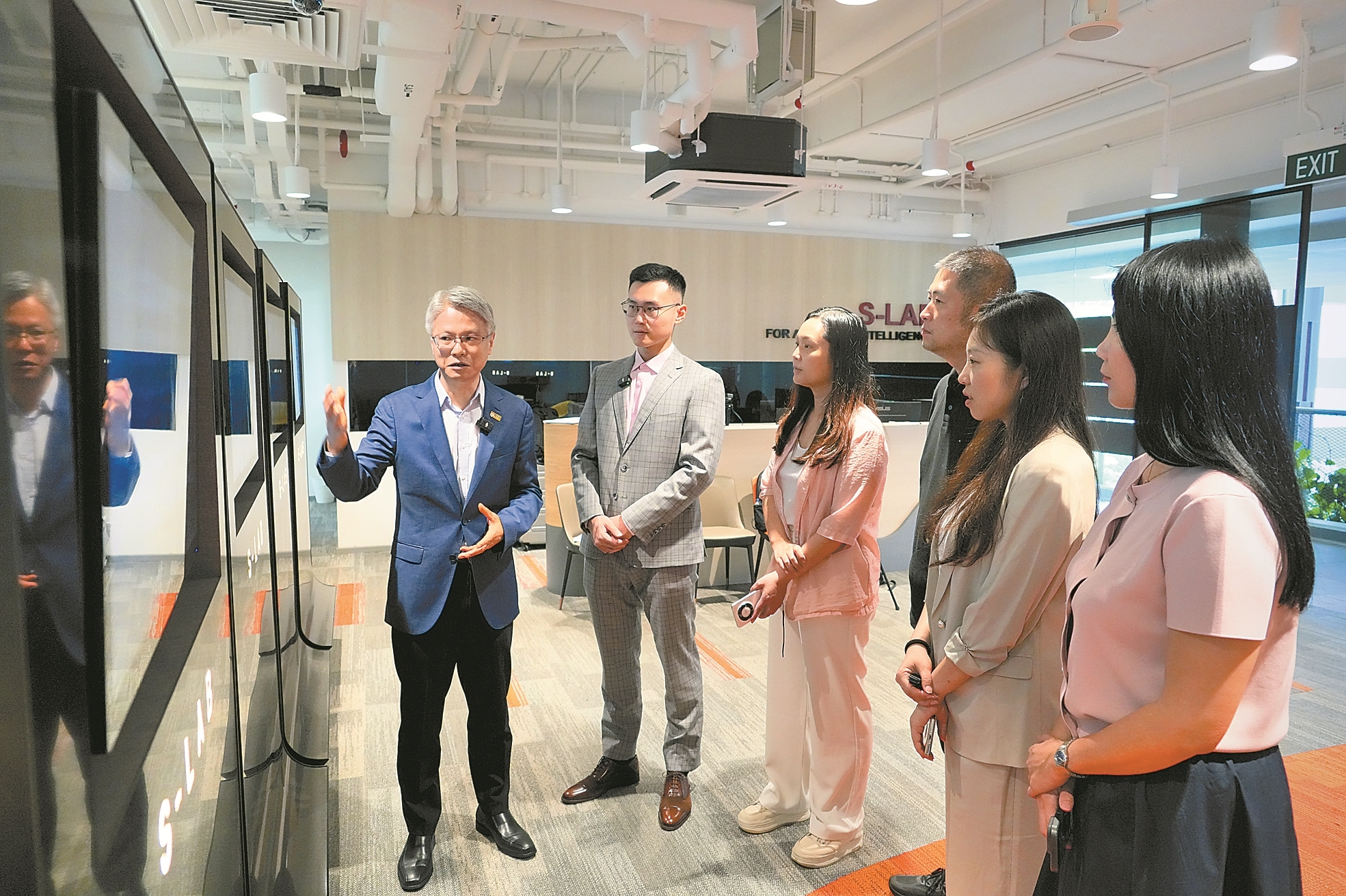 新加坡工程院院士、南洋理工大学校长讲座教授文勇刚为“AI体验官”介绍人工智能科研项目。