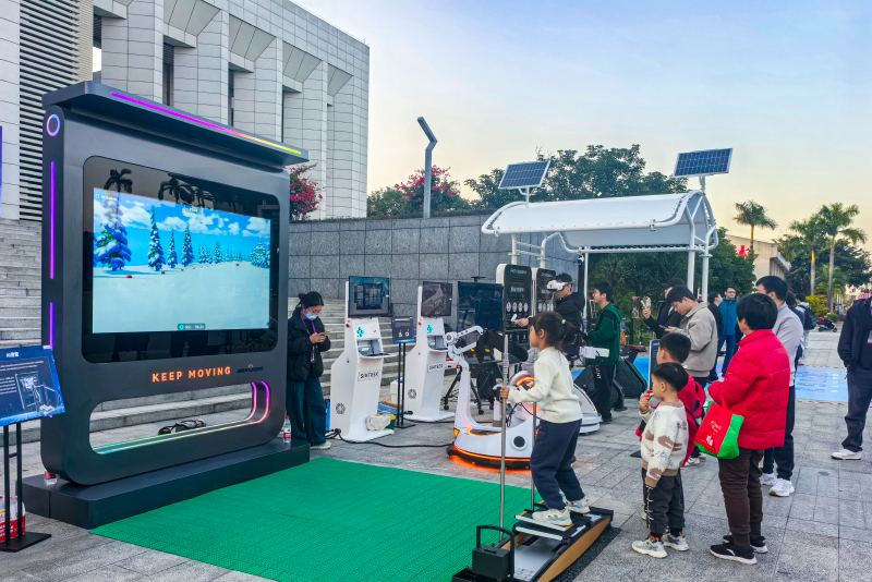在位于外场的AI生活体验场,AI+体育互动项目吸引众人驻足,观众在AI智能滑雪互动设备上沉浸式互动,感受“体育+科技”的跃动。在“未来新同事”板块,近20台各式各样、服务于不同场景的具身机器人化身“同事”,展现“实力AI”的机巧未来。冰冷的机器,因人的互动变得热气腾腾。