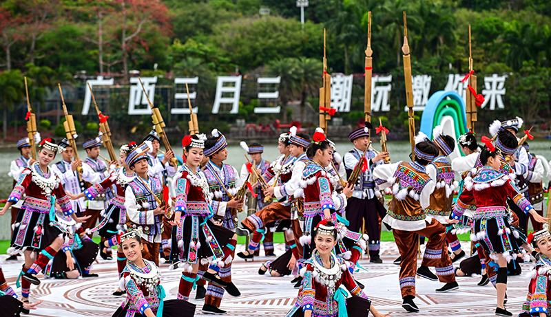 农历“三月三”是中国多个民族的传统节日。自2014年起,广西将“三月三”确定为地方性法定节假日,每年举办盛大庆祝活动,让全国游客畅游八桂山水、畅购特色好物、畅享漫时光假期。(陈燕)