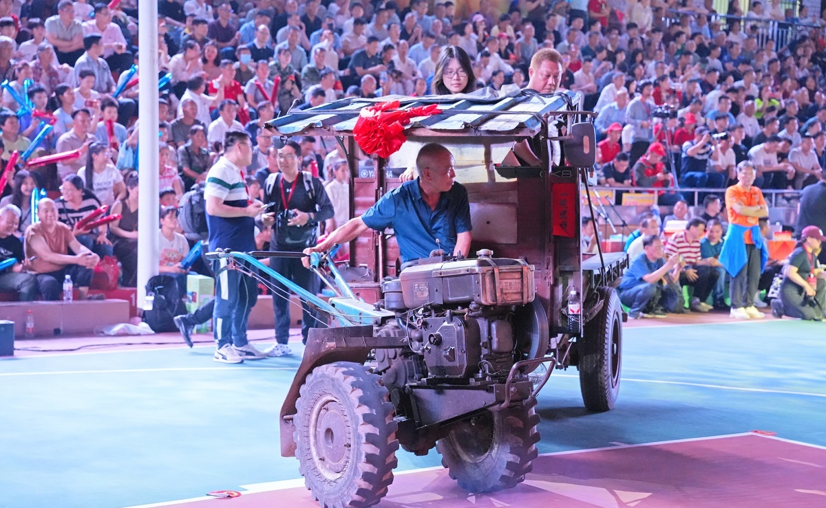 广西制造的“铁牛”载着歌手开上第九届广西万村篮球赛总决赛开幕式现场。金翔义 摄