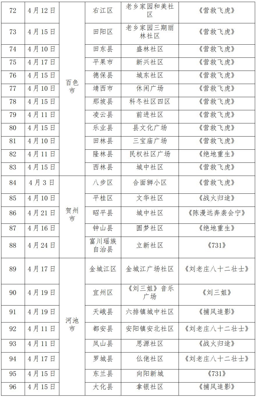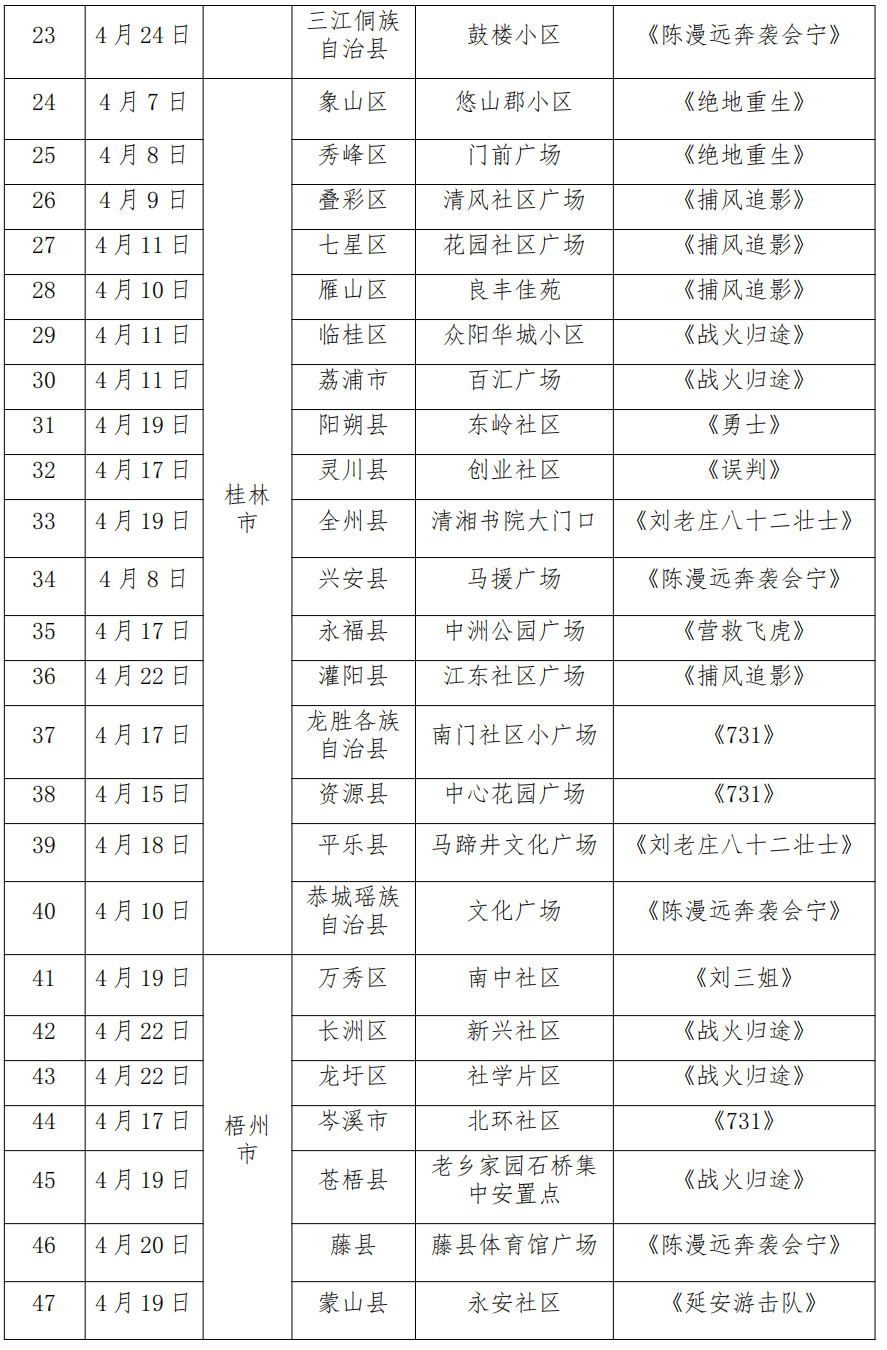 通过“八桂文化圈”小程序,关注各市组织安排的影院公益专场及社区、农村放映信息。