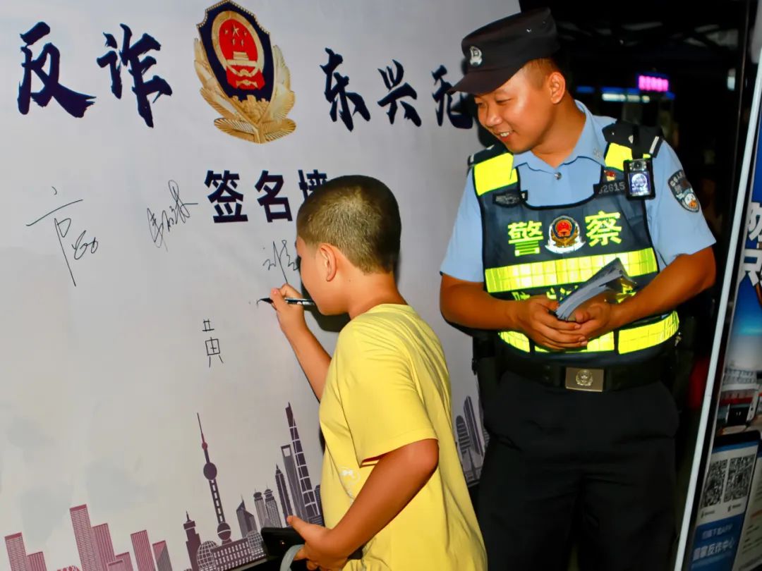 逛一次“反诈夜市”,装一个“反诈APP”,写一笔“反诈签名”,拍一张“警民合影”。在反诈“摊点”前,反诈宣传民警正忙得不可开交,小朋友们蜂拥而上,都在等着跟警察叔叔合影,一派其乐融融的景象。