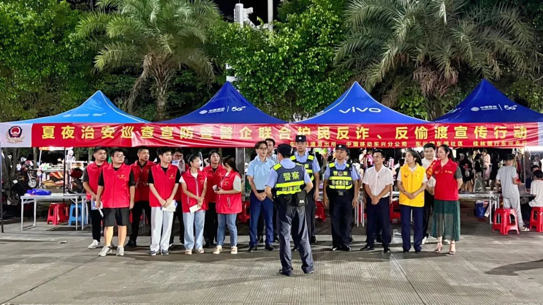 原来,当天晚上,东兴边境派出所联合中国移动、桂林银行以及东郊社区等,在夜市人流密集区域支起反诈宣传流动“摊点”,以展示展板、悬挂横幅、发放宣传单等形式,普及反诈知识,推广国家反诈中心APP。
