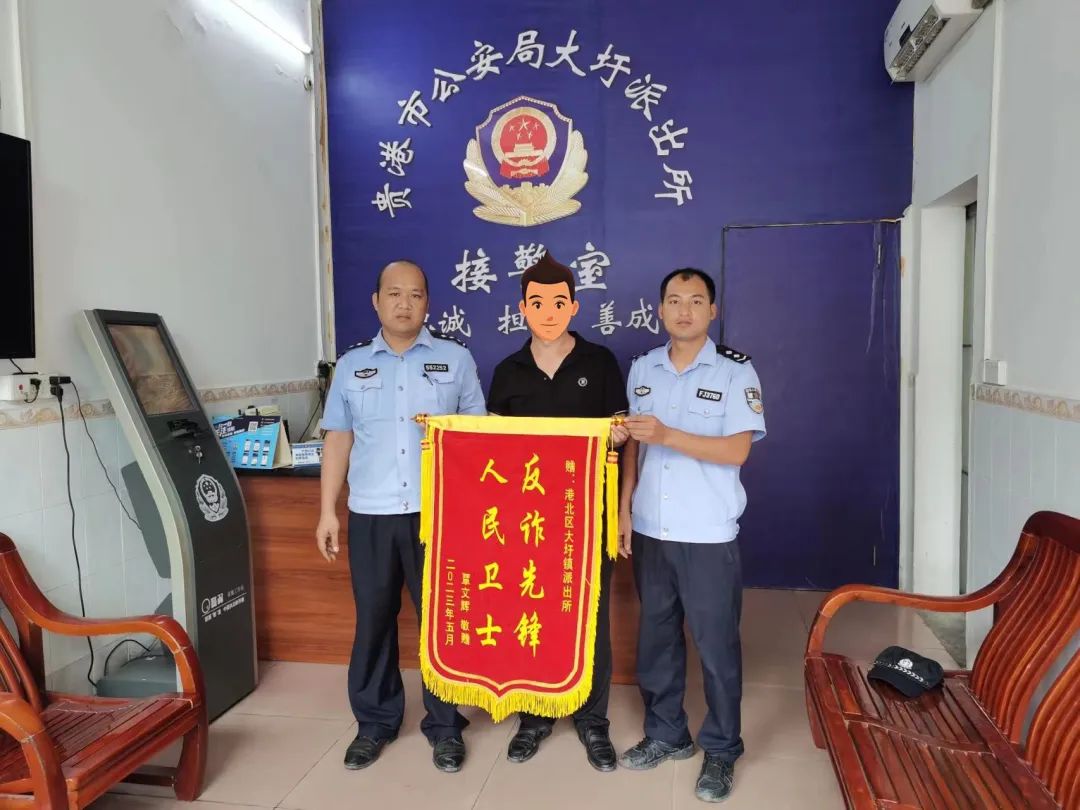5月21日,群众覃先生拿着一面写着“人民卫士,反诈先锋”的锦旗走进大圩派出所送到民警手中,感谢大圩派出所快速反应、紧急止付,为其挽回经济损失6000元。