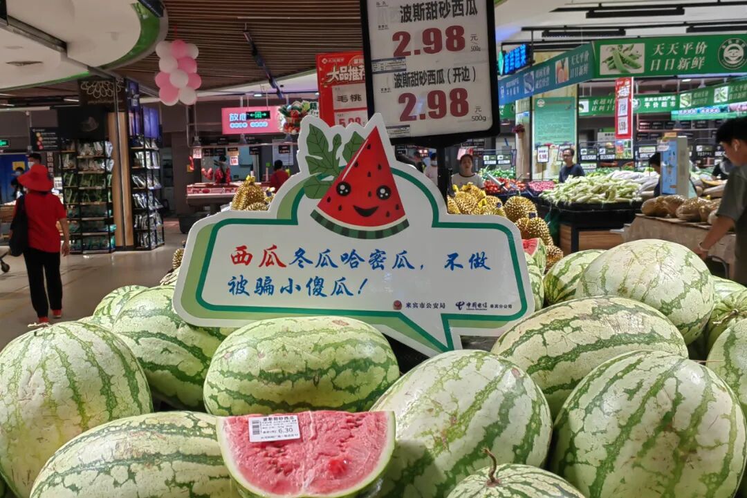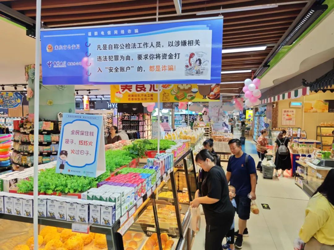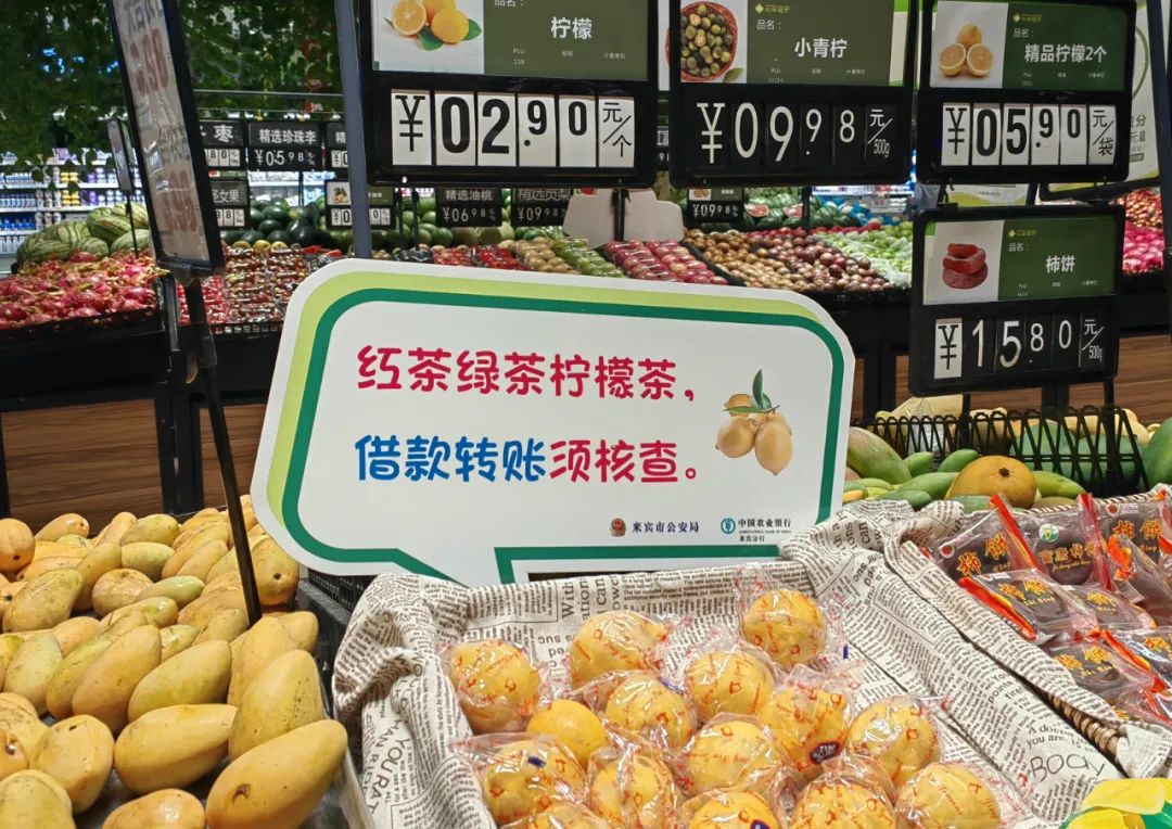 “眼泪可以为洋葱流、辣椒流、别为骗子流”“苹果芒果火龙果,骗你汇款是恶果”。一句句朗朗上口的反诈宣传警示标语,让到超市购物的群众体验“沉浸式反诈宣传模式”。这些标语对应超市的各种商品,让前来购物的市民在装满“菜篮子”的同时,也能注意捂紧自己的“钱袋子”。